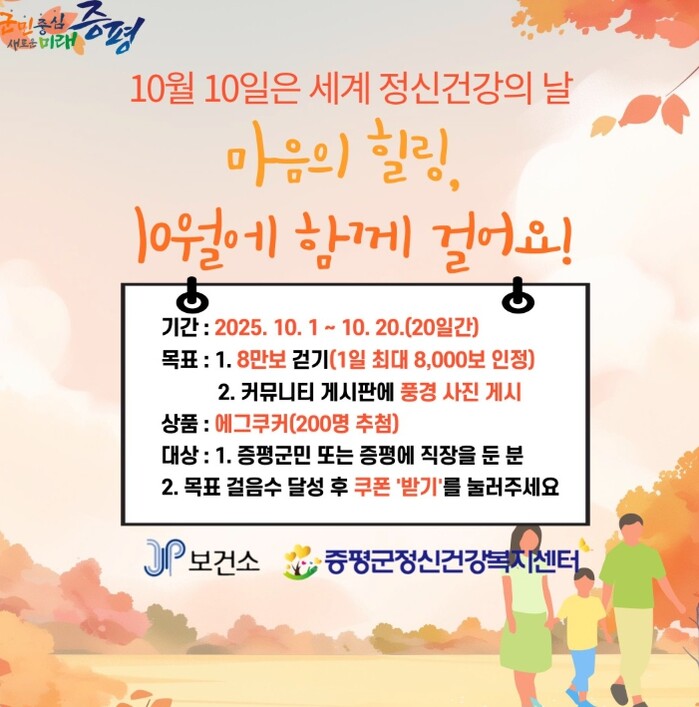 센터 관계자는 “가을의 청명한 공기를 즐기며 걷기를 통해 마음을 돌보고, 정신건강의 중요성을 함께 나누는 계기가 되길 바란다”며 “군민 여러분의 많은 참여를 부탁드린다”고 말했다.