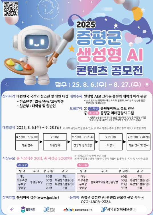 공모주제는 ‘생성형 AI로 그리는 증평의 매력과 미래 관광’으로, 참가자는 생성형 AI 기술을 활용해 증평을 담아낸 창작물을 출품하면 된다.