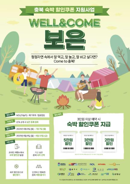 이번 할인쿠폰 사업은 충북 11개 시·군이 공동으로 추진하며, 할인쿠폰은 온라인 숙박예약 플랫폼(OTA)인 △야놀자 △여기어때 △땡큐캠핑에서 제공되며 플랫폼에 등록된 군내 숙박시설 이용 시 할인 혜택을 받을 수 있다.