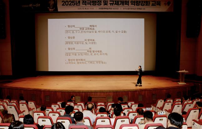 이번 교육은 인사혁신처 적극행정강사단 소속이자 한국능률인재개발원 대표인 안태윤 강사를 초빙해 ‘웃음과 즐거움이 함께하는 적극행정·규제개혁 교육’이라는 주제로 진행됐다.