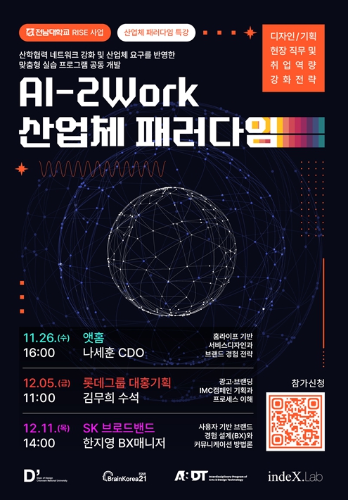 오는 11월 26일부터 시작되는 이번 프로그램은 전남대학교 디자인학과가 주최·주관하고 아트·디자인테크놀로지 협동과정이 공동주관한다.