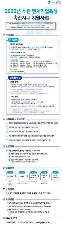 모집 공고일(2월 25일) 기준 수원 벤처기업육성촉진지구 내 입주기업이 신청할 수 있다. ▲수원델타플렉스 1~3단지 공장등록기업 또는 사업 단지 입주계약확인 기업 ▲서울대학교 농생명과학 창업지원센터 입주기업 ▲성균관대학교 자연과학캠퍼스 창업보육센터·연구소 입주기업 등이 대상이다.