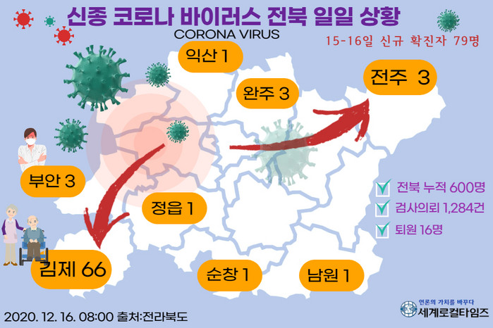 [세계로컬타임즈 조주연 기자] 전북도 보건당국은 15일~16일 사이 코로나19 신규 확진자가 79명 추가됐다.