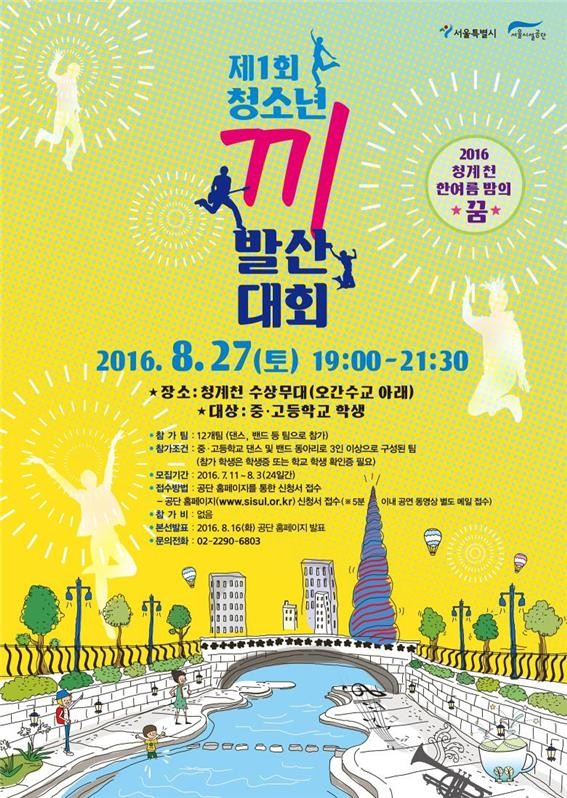 제1회 청계천 청소년 끼 발산대회는 오는 8월27일 저녁 7시에 청계천 수상무대에서 열리며 입상자에게는 상금과 상장이 수여될 예정이다.