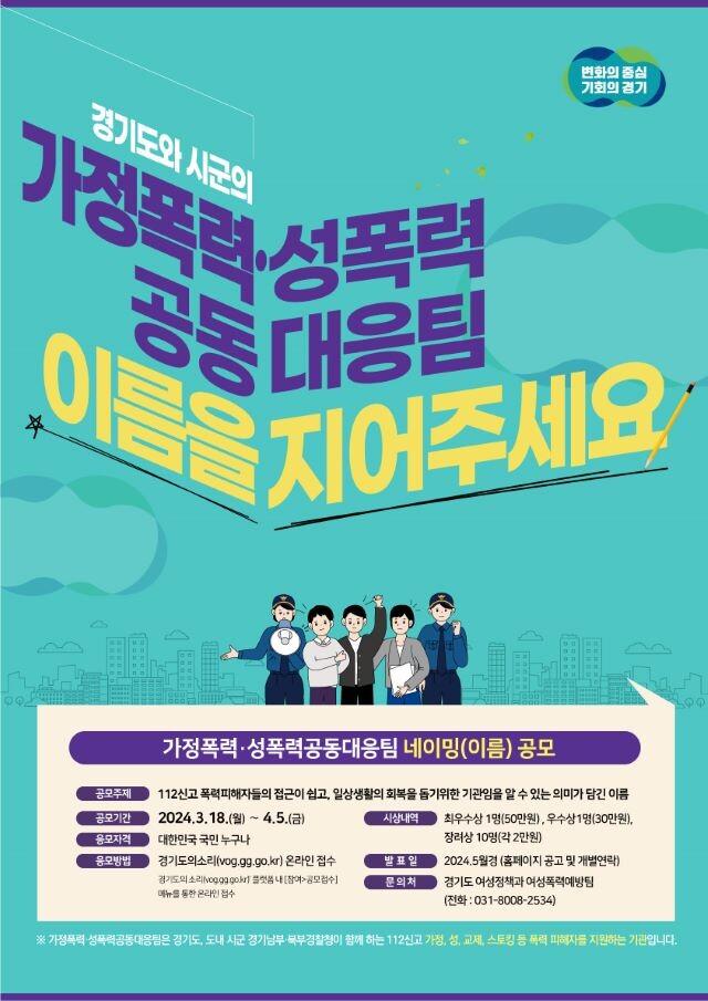 [세계로컬타임즈 이종화 기자] 경기도가 3월 18일부터 4월 5일까지 ‘가정폭력·성폭력공동대응팀’ 이름 공모전을 전 국민을 대상으로 연다.