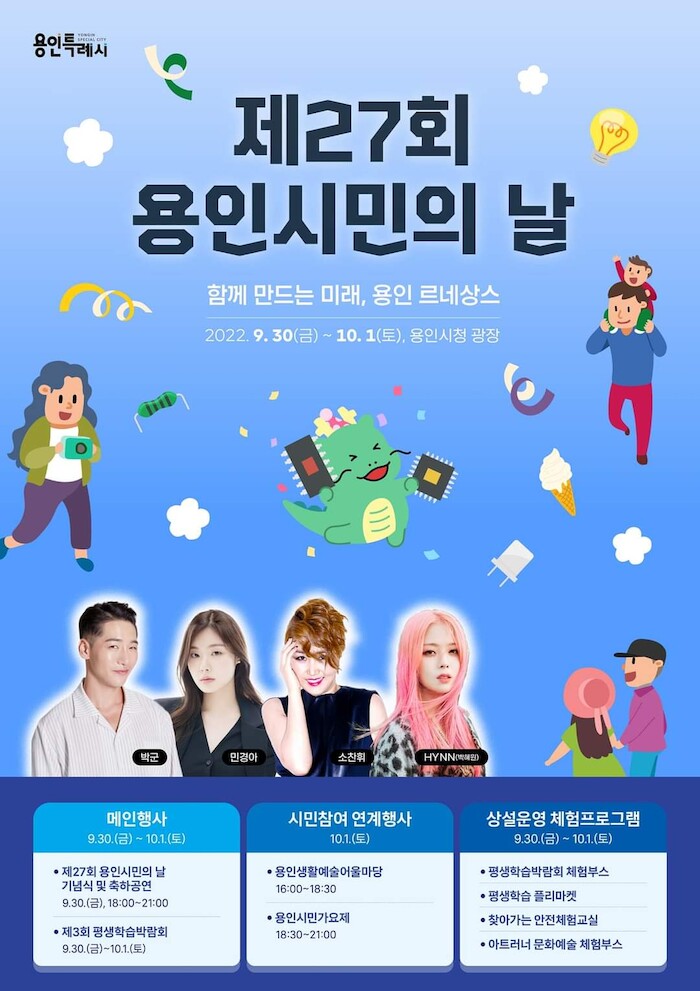용인특례시가 개최하는 이번 행사는 민선 8기 비전인 ‘함께 만드는 미래, 용인 르네상스’를 주제로 9월 30일부터 10월 1일까지 이틀간 용인시청 하늘광장에서 '제27회 용인시민의 날 행사'가 열린다.