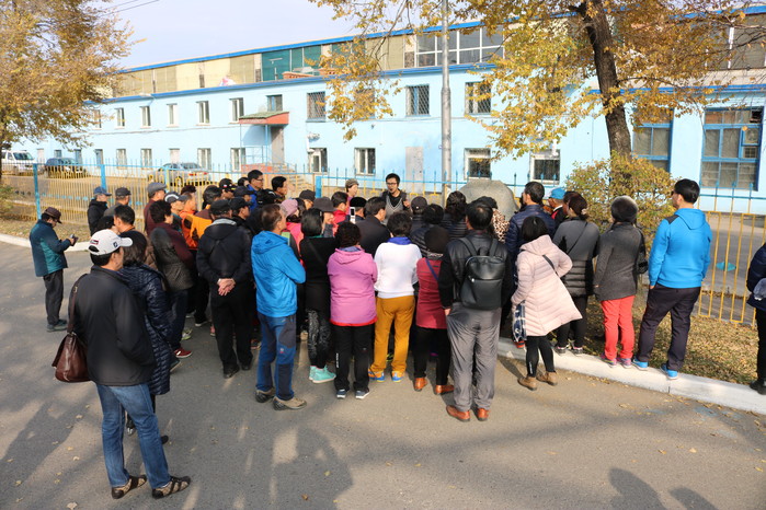 | ▲ 탐방단이 10월 19일 하바롭스크 향토박물관 앞에 시멘트가 발라진 돌거북비석(발해유물 추정)에 대해 설명을 듣고 있다. |