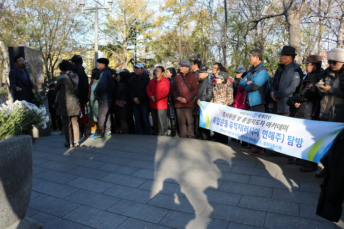 | ▲ 탐방단이 10월 21일 블라디보스토크의‘신한촌기념비’를 방문해 단체로 참배한 후 가이드로부터 연해주 항일 독립운동의 발자취와 기념비 건립배경에 대해 설명을 듣고 있다. |