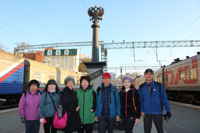 | ▲ 세계일보 조사위원회 용산구협의회 회원들이 10월 20일 시베리아 횡단열차 종착역인 블라디보스토크역 9,288㎞기념비 앞에서 기념촬영하고 있다. |