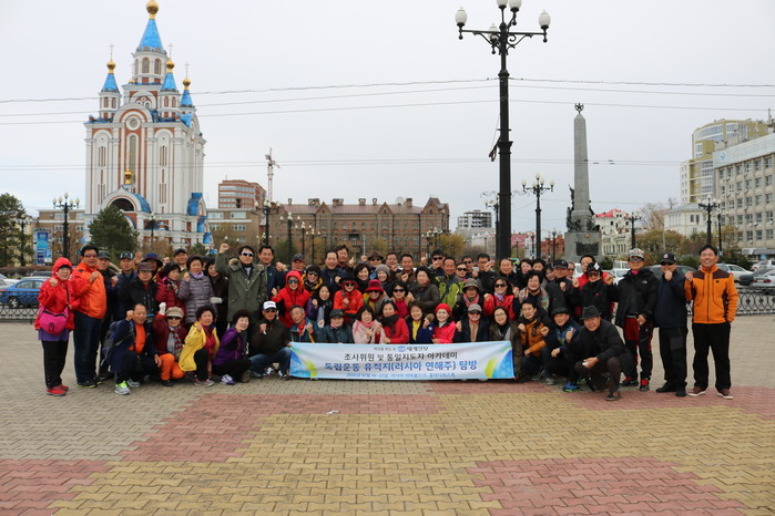 | ▲ 탐방단이 10월 19일 아무르강 앞에 위치해 있는 꼼소몰스까야 광장에서 기념촬영하고 있다. |