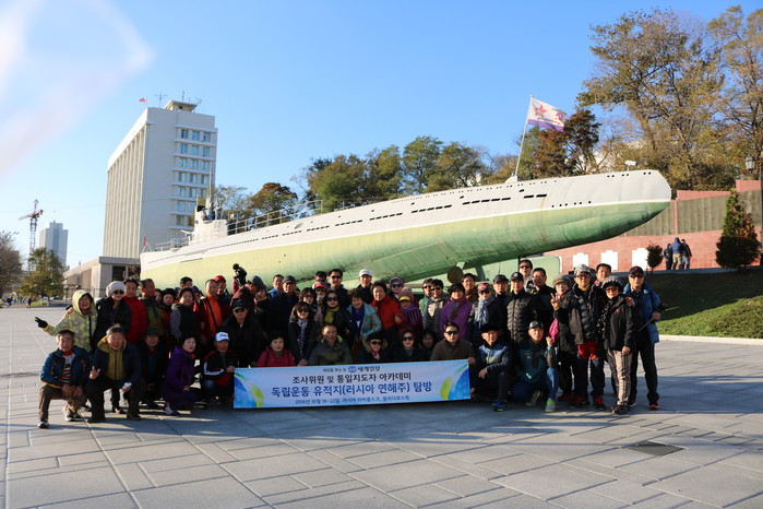 | ▲ 탐방단이 10월 20일 블라디보스토크의 2차세계대전 참전 잠수함박물관 앞에서 기념촬영하고 있다. |
