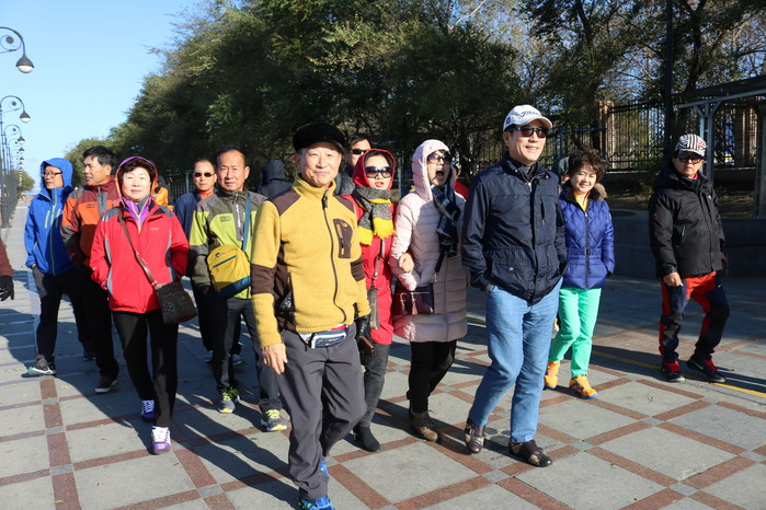 | ▲ 박귀종 조사위원 중앙위원회 의장(오른쪽세번째)이 10월20일 일행들과 함께 해양공원으로 변한 구한촌거리를 거닐고 있다. |