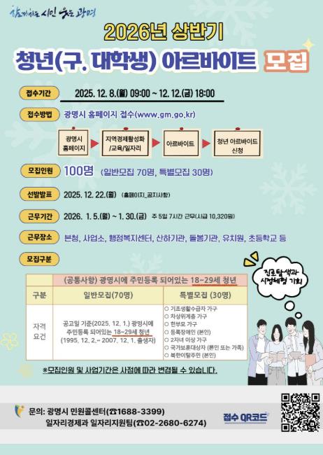 [세계로컬타임즈] 광명시는 오는 8일부터 12일까지 ‘2026년 상반기 청년 아르바이트’ 참여자 100명을 모집한다.