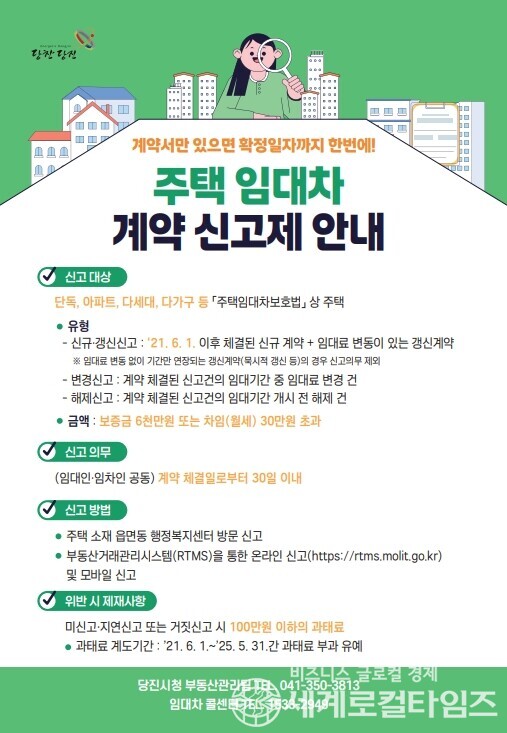 [세계로컬타임즈] 당진시가 오는 6월 1일부터 ‘주택 임대차 계약 신고제’ 위반 시 과태료를 본격 부과한다. 이는 4년간 유지되었던 계도기간이 오는 5월 31일 종료됨에 따른 조치로, 앞으로는 신고 의무를 이행하지 않으면 최대 100만 원의 과태료를 물게 된다.