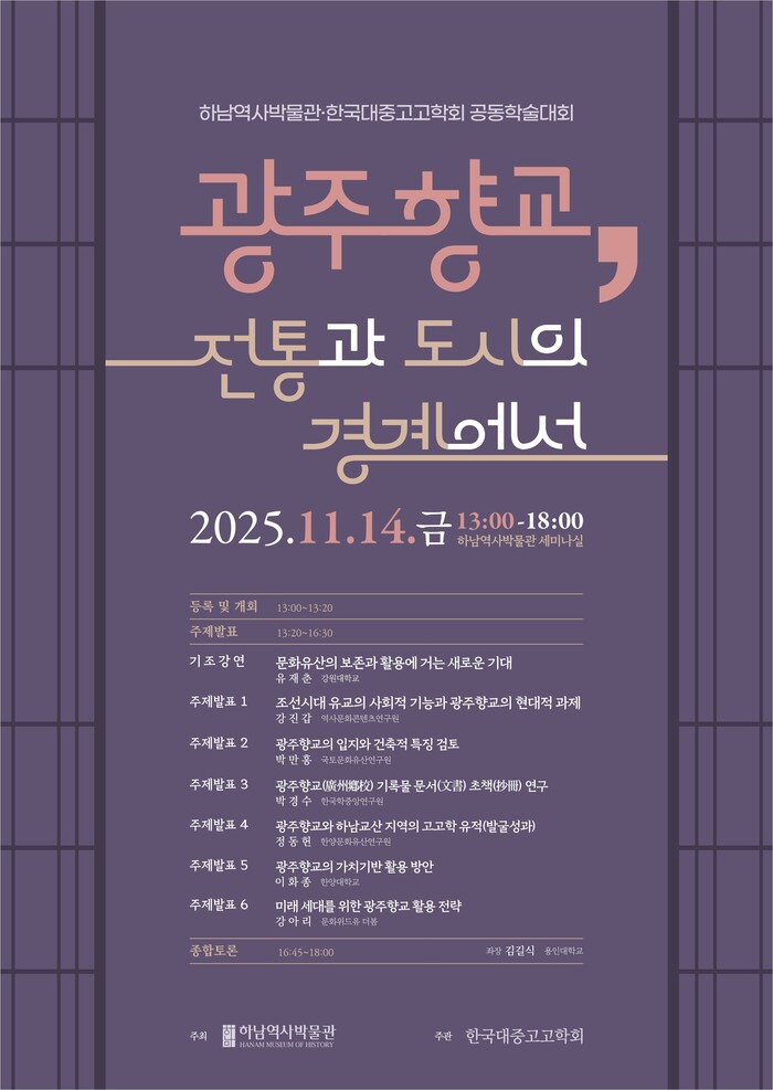 이번 학술대회는 하남의 대표 문화유산이자 조선시대 유교 교육의 중심기관이었던 광주향교에 주목하여, 향교의 기능과 건축적 특징, 소장 고문서 해제 및 고고학적 성과 등 전문 연구를 공유하고, 광주향교의 보존과 활용 반안을 중점으로 살펴본다.
