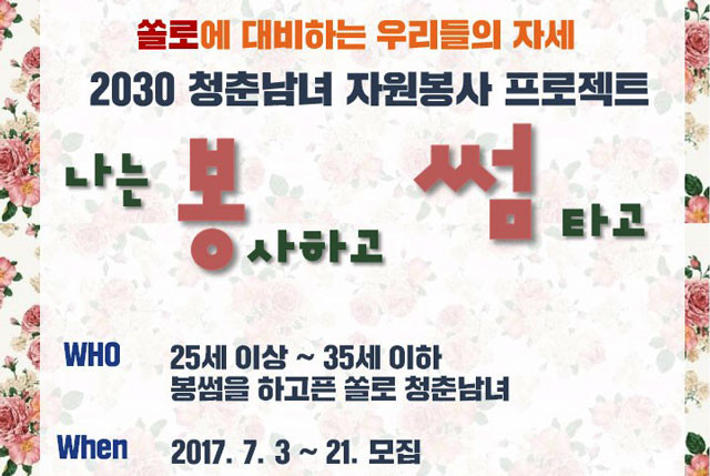 [세계로컬신문 신동만 기자] 경북 경주시종합자원봉사센터는 오는 21일까지 ‘나는 봉사하고 썸 탄다!’ 프로그램의 신청자를 모집한다.