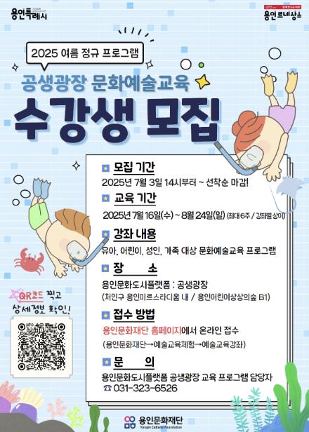 [세계로컬타임즈] 용인문화재단은 7월 3일부터 ‘2025년 용인문화도시플랫폼 공생광장 문화예술교육 프로그램’의 여름 정규 강좌 수강생을 모집한다.