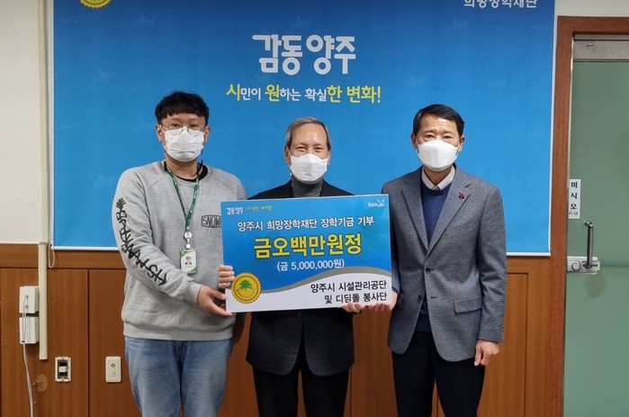 [세계로컬타임즈 한기선 기자] 양주시시설관리공단(이사장 이재호)은 지난 15일 관내 저소득층 및 성적우수 학생들의 교육여건 증진을 위한 희망 장학금 500만원을 양주시희망장학재단에 기탁했다.