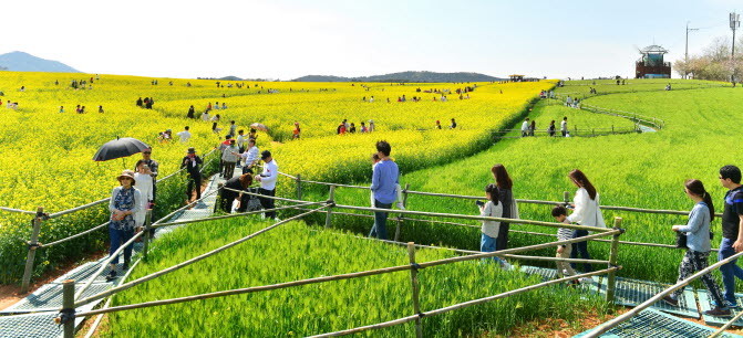 올해 축제는 30여만 평에 펼쳐진 초록 물결 속 청보리와 노란 유채꽃이 함께 어우러진 사잇길을 걸으면서 일상생활에 지친 관광객들의 피로를 말끔히 털어버리고 마음의 여유를 되찾는 자리가 됐다.