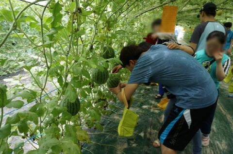 | ▲ 애플수박 농장을 방문한 시민들이 수박 수확을 하고 있다.<사진제공=창원시청> |