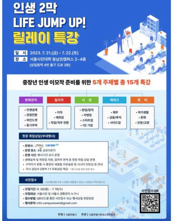 릴레이 특강 수강 신청은 26일부터 서울시평생교육진흥원 누리집에서 하면 되고, 1:1 무료취업상담 부스는 당일 현장 접수로만 참여 가능하다.