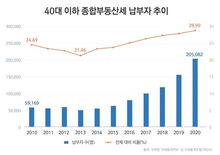 27일 부동산업계에 따르면 국세청이 지난해 발표한 국세통계연보 자료 분석 결과, 지난 2020년 종부세 납부자 중 40대 이하는 총 20만5,082명으로 집계됐다.