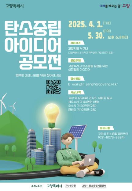 탄소중립 아이디어 공모전은 5월 30일까지 진행되며, 고양시 탄소중립에 관심 있는 누구나 개인 또는 팀으로 참여할 수 있다. 참가 신청은 고양시 탄소중립지원센터 이메일을 통해 가능하다.