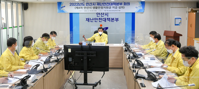 | ▲ 안산시장과 시 관계자가 재난안전대책본부 회의를 하고 있다. (사진=안산시) |