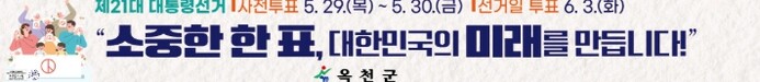 군 관계자는 “군민의 소중한 한 표가 건강한 민주주의를 만드는 밑거름이 된다”며 “군민 모두가 이번 대통령선거에 참여하여 소중한 권리를 행사해 주시길 바란다”고 전했다.