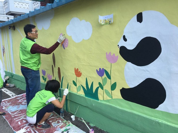 | ▲ 경기도청소년수련원 브라보 가족봉사단원들이 벽화그리기 봉사를 하고 있는 모습.<사진제공=경기도청> |