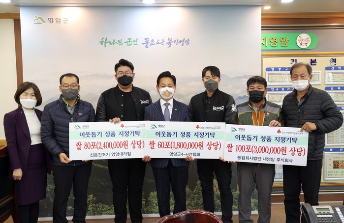 기부내역은 농업회사법인 새영암 주식회사(강광천 대표)에서 쌀 100포를 기탁하였으며, 신흥건조기 영암대리점(양명직 대표)에서 쌀 80포를, 영암군4H-연합회(박태승 회장)에서는 쌀 60포를 저소득 가정을 위해 기탁하였다.