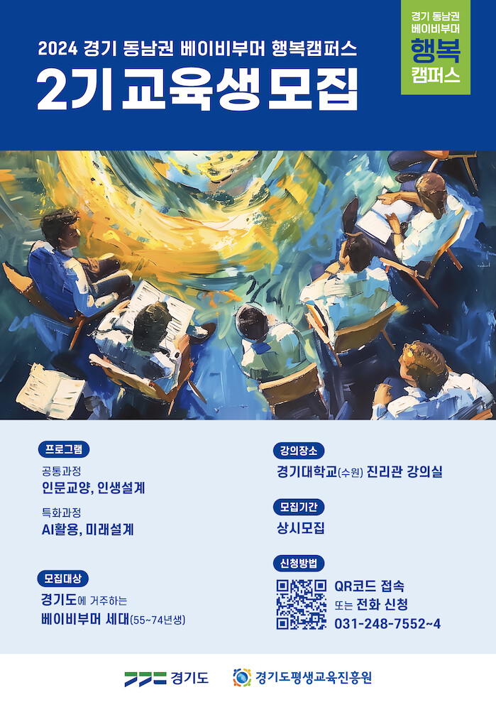 동남권 행복캠퍼스의 2기 프로그램은 ▲베이비부머 세대의 창직·창업 도전하기(100명) ▲AI를 활용한 비즈니즈 탐색하기(20명) ▲AI를 활용한 브랜드 기획부터 디자인까지(20명) ▲AI를 활용한 내 책 만들기(20명) ▲AI를 활용한 미술 창작물 만들기(20명) 등 11개 과정이 9월 4일부터 경기대학교 수원캠퍼스 진리관에서 시작한다.