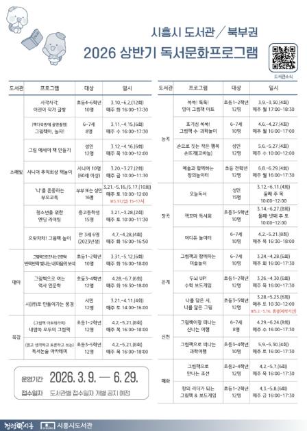 이번 상반기 프로그램은 영유아, 초등학생, 청소년, 성인, 시니어 등 전 연령층을 아우르는 맞춤형 구성으로, 시민들의 독서 흥미를 높이고 문화적 소양을 확장하는 데 중점을 두고 마련됐다.
