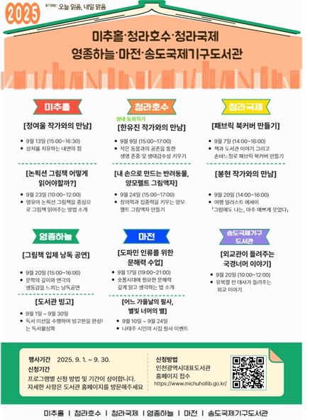 한수미 시 미추홀도서관장은 “이번 프로그램은 단순한 강연과 체험을 넘어 시민들이 책과 문화를 매개로 자신을 돌아보고, 다양한 연령층이 독서를 통해 정서적 풍요와 창의적 경험을 얻는 계기가 될 것”이라고 말했다.