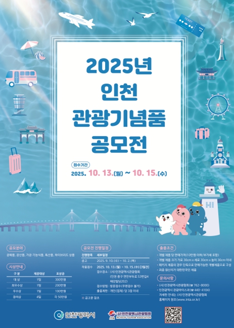 작품 접수는 오는 10월 13일부터 15일까지 3일간, (사)인천광역시관광협회(인천 중구 연안부두로 53번길 4, 해강빌딩 2층 202호)에서 진행된다.
