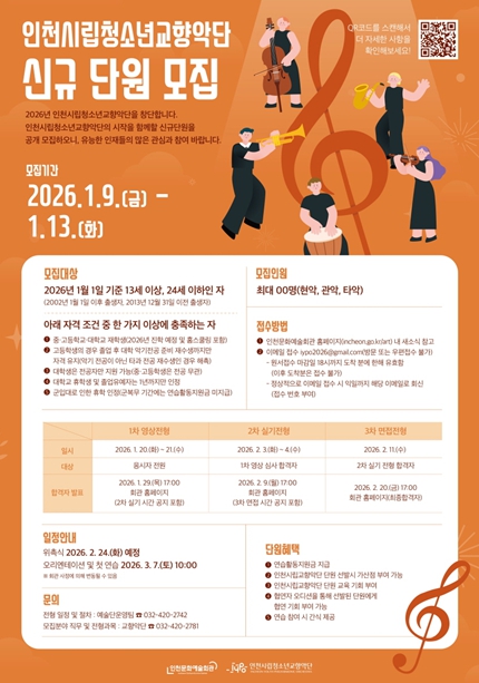 시는 지역 문화예술 인재를 육성하고 시민들의 문화 향유 기회를 확대하기 위해 오는 2026년 2월 인천시립청소년교향악단을 창단할 계획이다.