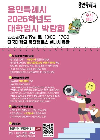 [세계로컬타임즈] 용인특례시는 7월 19일 오후 1시부터 5시 30분까지 단국대학교 죽전캠퍼스 실내체육관에서 ‘2026학년도 수시대비 대학입시박람회’를 개최한다고 25일 밝혔다.