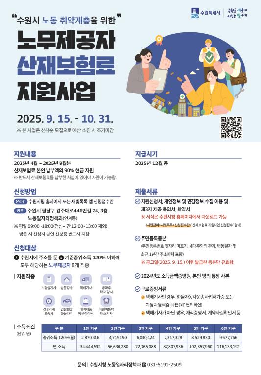 지원 해당 월 1일부터 심사완료일까지 수원시에 주민등록이 돼 있는 기준중위소득 120% 이하(소득금액증명원 기준) 노무제공자가 신청할 수 있다. 산재보험 납부 내역 확인 후 12월 중 신청자의 계좌로 지급한다. 예산이 소진되면 지원사업은 조기 마감될 수 있다.