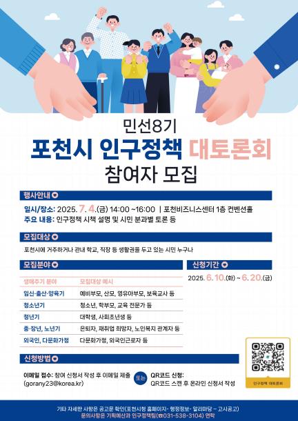 포천시 관계자는 “이번 토론회는 시민의 목소리를 인구정책에 반영해 포천의 미래를 바꿀 수 있는 또 하나의 기회”라며, “관심 있는 시민들의 적극적인 참여를 기대한다”라고 말했다.
