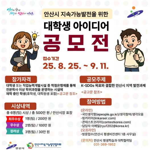 [세계로컬타임즈] 안산시는 내달 11일까지 대학생들의 창의적인 아이디어를 시정에 반영하기 위한 ‘2025 대학생 아이디어 공모전’을 개최한다고 25일 밝혔다.