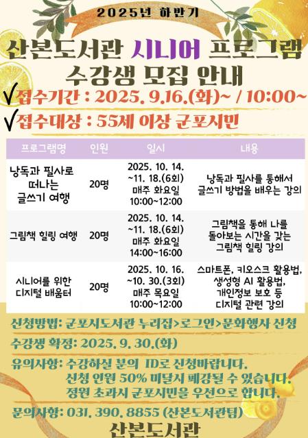 각 프로그램의 참가신청은 9월 16일 10시부터 군포시도서관 누리집에서 선착순으로 진행하며, 수강료는 무료이다.