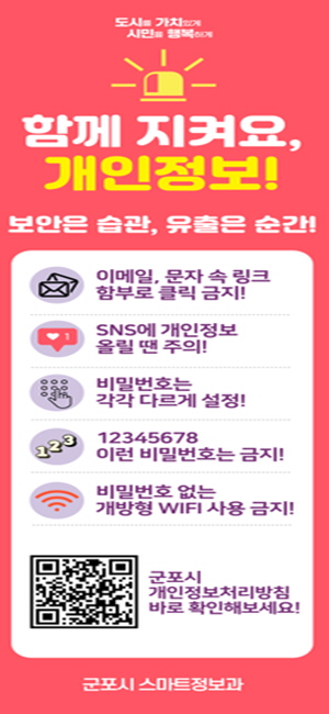 시는 이 기간 동안 생산된 문서에 개인정보 보호 표어를 삽입해 시민과 직원 모두가 보호의 중요성을 상기하도록 하고, 개인정보처리방침을 손쉽게 확인할 수 있도록 민원대 등 시설 내에 QR코드를 게시할 예정이다. 또한 군포시청 민원봉사실 입구 및 군포시청 1층 로비 등 시민들이 자주 찾는 공간에는 홍보 배너를 설치하여 개인정보 보호의 중요성을 자연스럽게 인식할 수 있는 분위기를 확산시킬 계획이다.