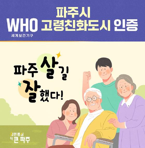 이에 파주시는 지난해 5월 파주시민 전 세대가 신체적·정서적·사회적으로 건강한 삶을 영위할 수 있는 환경을 조성하기 위하여 고령친화도시 조성 연구용역을 실시해 올해 4월 세계보건기구에 고령친화도시 인증을 위한 네트워크 가입 신청서를 제출했으며, ▲외부환경과 시설 ▲주거환경 안정성 ▲교통수단 편의성 ▲건강 및 지역사회 돌봄 ▲사회참여와 일자리 ▲의사소통과 정보 ▲사회적 존중 및 통합 ▲여가 및 사회활동 등 8개 영역 심사 등을 거쳐 인증 승인을 이뤄냈다.