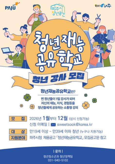 ‘청년재능공유학교’강사 지원 방법과 신청 서식 등 자세한 사항은 파주시청 누리집 채용공고 게시판을 통해 확인할 수 있으며, 기타 자세한 사항은 청년청소년과 청년정책팀으로 문의하면 된다.