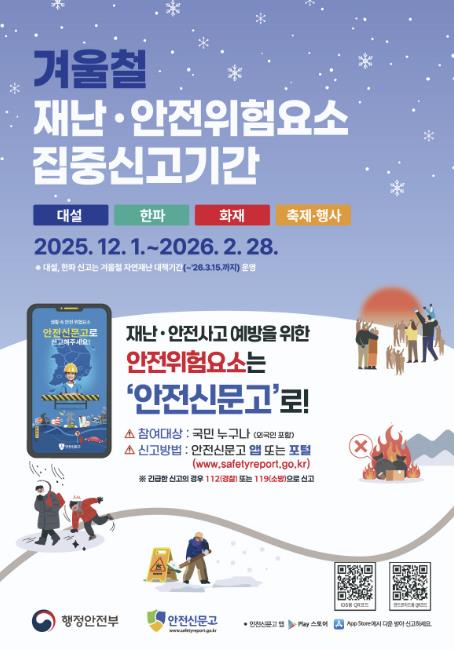 이번 집중신고 기간은 겨울철에 특히 많이 발생하는 재난·안전사고를 사전에 예방하기 위해 마련된 것으로, 주요 신고 유형은 ▲대설 ▲한파 ▲화재 ▲축제·행사 등 4개 분야다.