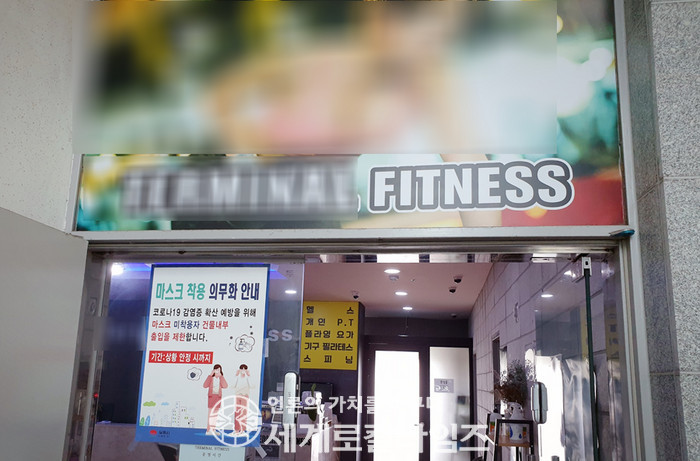 | ▲ 김제의 한 헬스장 입구에 '마스크 미착용 출입금지 안내' 표시되어 있다(사진=김제시 제공) |