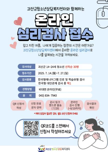모집 인원은 괴산군에 거주하는 14세~24세 청소년 30명이며, 오는 14일부터 27일까지 QR코드를 통해 네이버 폼 신청이 가능하다. 검사비는 전액 무료다.