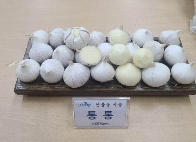 ‘통통’마늘은 쪽수가 4~6개로 적고 알이 15g 이상으로 크며 외통마늘 생산성이 우수한 것이 특징이다.