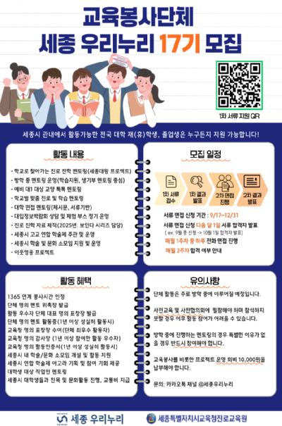 세종우리누리는 2018년에 세종 청년들이 자발적으로 창립한 교육봉사단체로, ‘선배 없는 학교의 선배가 되자’라는 창립 기치 아래 다양한 진로·진학 지원 활동을 펼치고 있다.