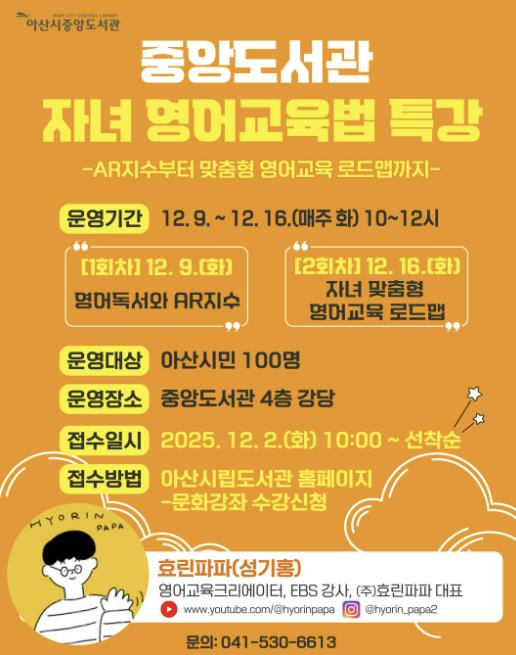 고영이 시립도서관장은 “이번 특강이 자녀 영어교육 고민 해소에 도움이 되길 바란다”며, “앞으로도 특화서비스 확대를 통해 더 나은 교육환경 마련을 위해 노력하겠다”고 말했다.